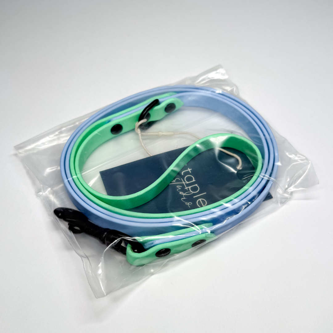 Manufactured in the USA, BioThane® is a polyester webbing with an external PVC coating. The PVC coating makes it strong, durable, waterproof, easy to clean and to maintain. Available in assorted colours, this makes BioThane® superior to leather as it is extremely weather-proof! To top if off, our crafts are coated at the ends for a true waterproof finish.